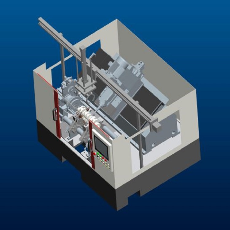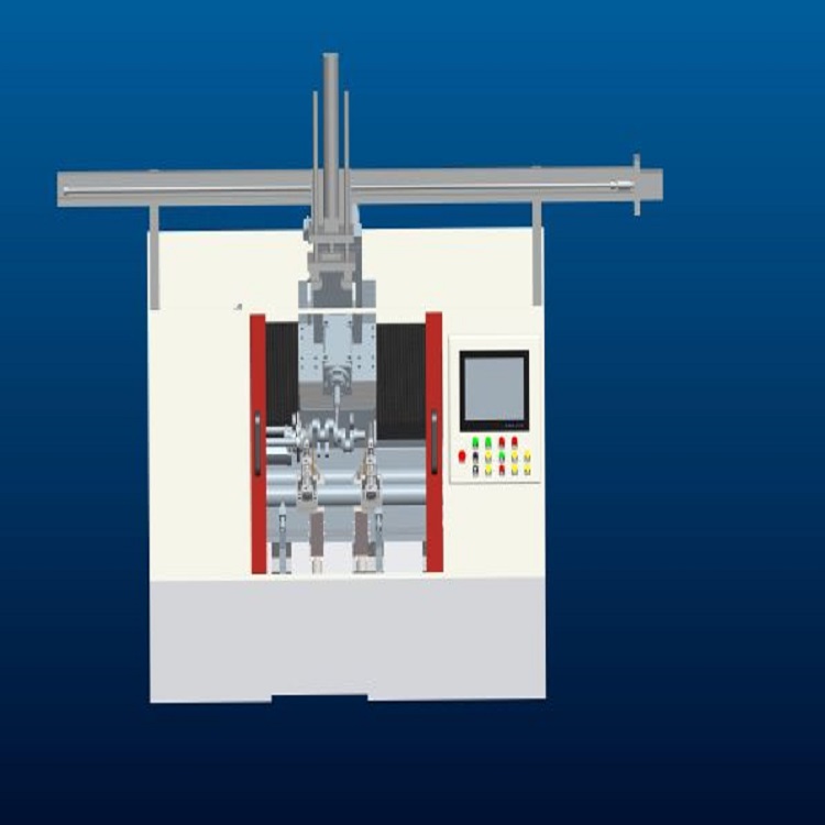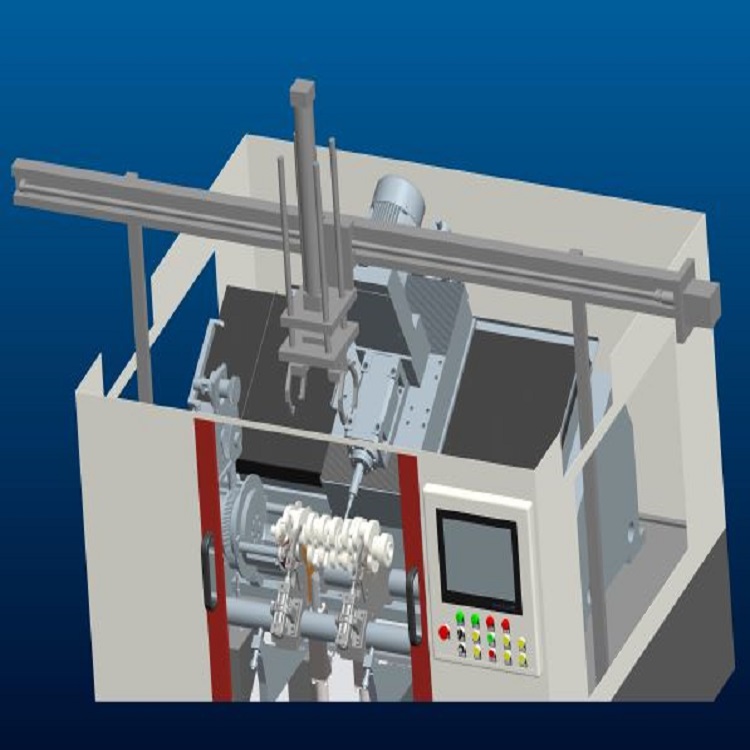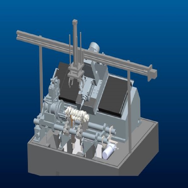 其工作流程如下:將曲軸定向吊放至升降托架上,關(guān)閉防護(hù)門,噴油霧進(jìn)行微量潤(rùn)滑,同時(shí)升降托架下降,曲軸定位放置在曲軸平衡機(jī)支承軸瓦上,動(dòng)平衡機(jī)啟動(dòng)并自動(dòng)測(cè)量,顯示出曲軸兩端不平衡量的大小和相位、相應(yīng)平衡塊上的校正孔數(shù)量、方位和深度。測(cè)量完畢后,壓緊裝置壓緊曲軸。根據(jù)測(cè)量結(jié)果數(shù)控鉆床在伺服系統(tǒng)控制下,由左至右依次移動(dòng)并停在相應(yīng)平衡塊方位,同時(shí)平衡機(jī)主軸在伺服系統(tǒng)控制下帶動(dòng)曲軸轉(zhuǎn)動(dòng),使平衡塊去重位置依次對(duì)準(zhǔn)鉆床鉆頭后,校正鉆床和壓緊臂壓緊曲軸并按孔深進(jìn)行自動(dòng)鉆孔校正,同時(shí)鉆頭的微量冷卻系統(tǒng)和吸霧器啟動(dòng)對(duì)鉆頭進(jìn)行冷卻并對(duì)油霧吸取。校正完成后鉆頭潤(rùn)滑停止,鉆頭退回,壓緊裝置松開,平衡機(jī)再次運(yùn)轉(zhuǎn)進(jìn)行復(fù)檢。如補(bǔ)平衡量過大一次不合格,則進(jìn)行第二次校正,二次校正后再次復(fù)檢,合格后,托架上升,放置新工件,繼續(xù)進(jìn)行第二根曲軸的平衡測(cè)量操作。如二次平衡校正后仍超差,設(shè)備自動(dòng)停機(jī)報(bào)警,取下曲軸放到不合格隔離區(qū),設(shè)備繼續(xù)進(jìn)行其他曲軸的自動(dòng)加工。本設(shè)備所有動(dòng)作在啟動(dòng)后全部由計(jì)算機(jī)測(cè)量及伺服控制系統(tǒng)自動(dòng)完成,操作簡(jiǎn)單、使用方便、安全可靠。人性化的中文(英文)操作界面,可任意設(shè)定校正半徑,鉆孔直徑,鉆孔間距及******鉆孔深度等參數(shù),亦可動(dòng)態(tài)顯示鉆孔深度。另外,本機(jī)針對(duì)不同型號(hào)工件更換方便,只須調(diào)出相應(yīng)菜單,按照標(biāo)尺刻度調(diào)整支承間距,更換相應(yīng)軸瓦即可。